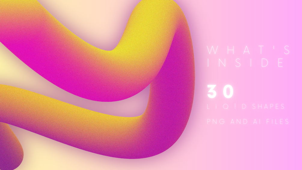 By purchasing L i Q ! D, you will gain lifetime access and commercial rights to 30 gradient 3D liquid shapes. These shapes are fully customizable with Adobe Illustrator. Files come both in png (with transparent background) and ai format (Adobe Illustrator).